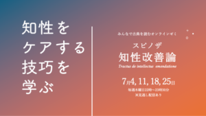 この度、スピノザ研究者である佐々木晃也氏を講師としてお迎えし、古典読解ゼミを一般公開することになりました。5月から8月にかけて、みなさんと一緒にスピノザ『知性改善論』(講談社学術文庫)をテキストに読んでいきます。